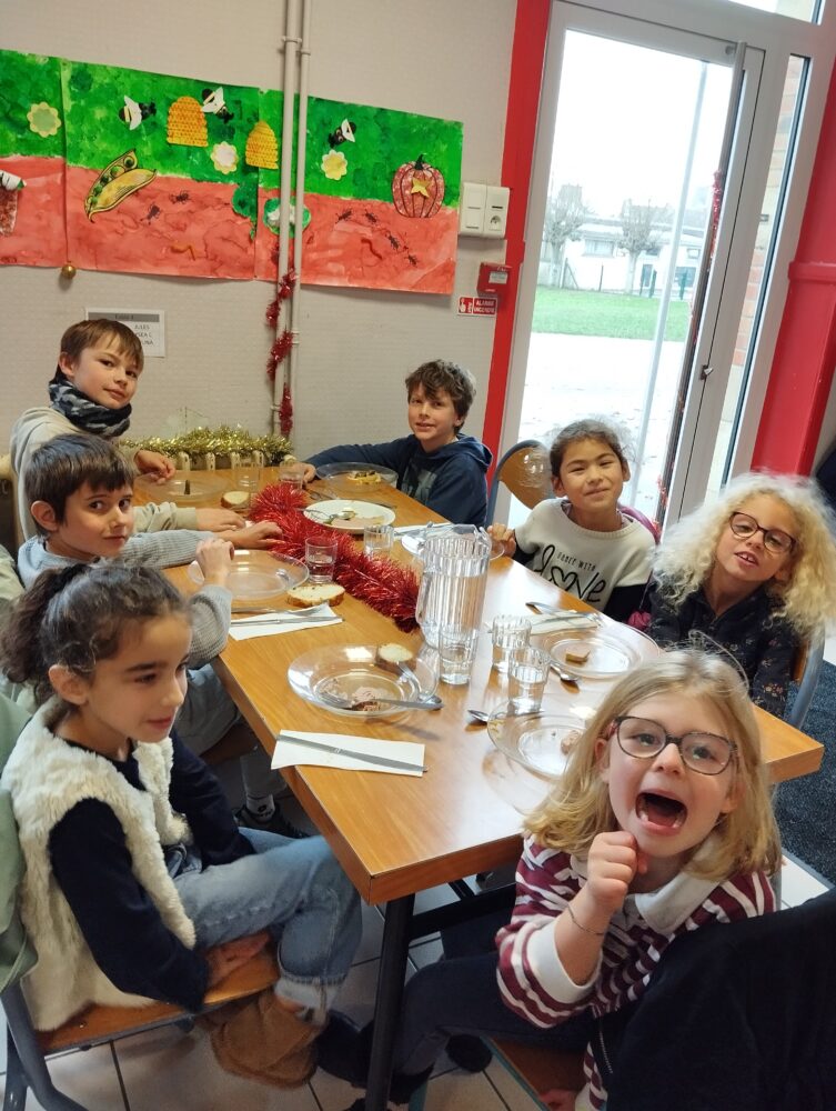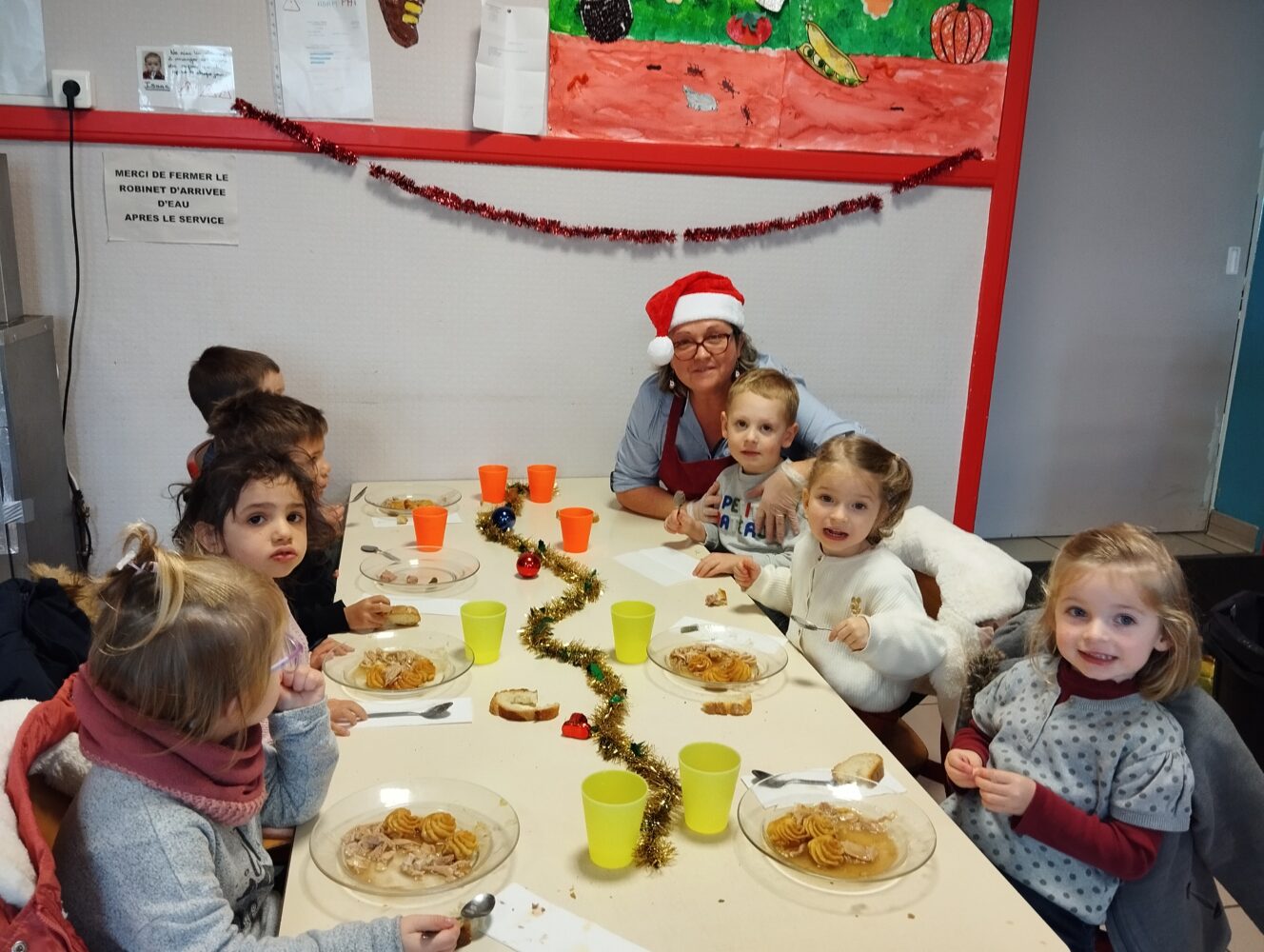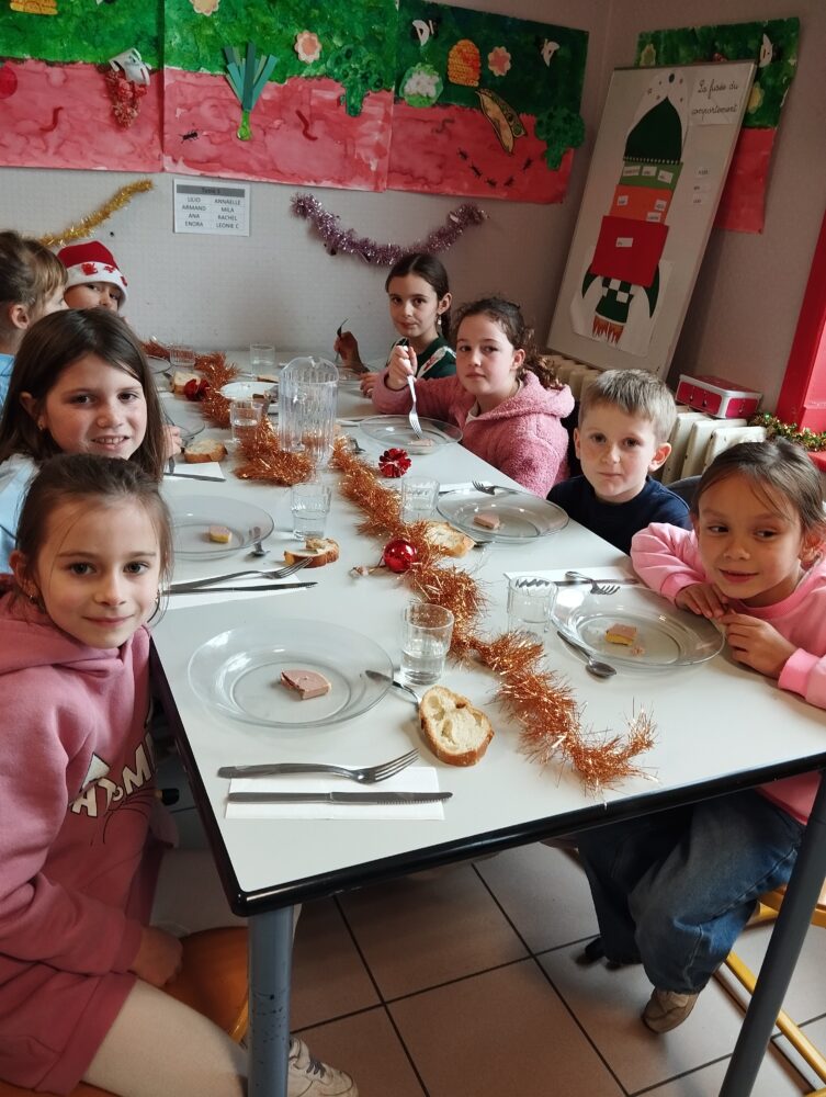 Même à la cantine,les enfants ont partagé un repas festif de Noël. Mireille, la dame de cantine avait décoré les tables pour l’occasion :