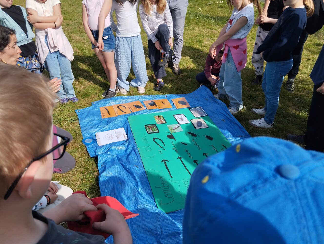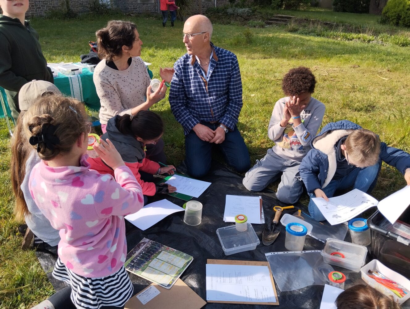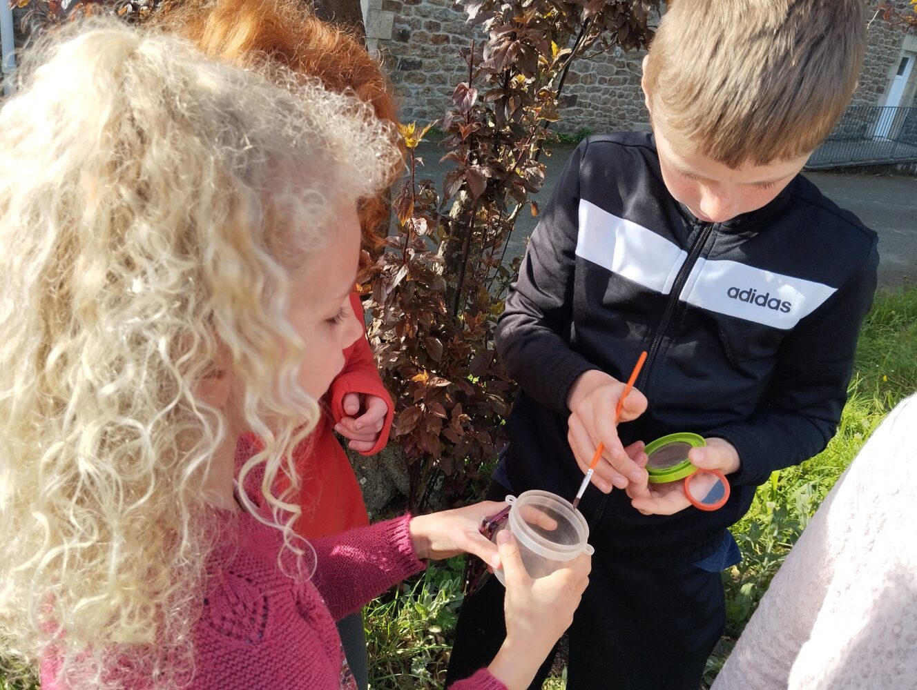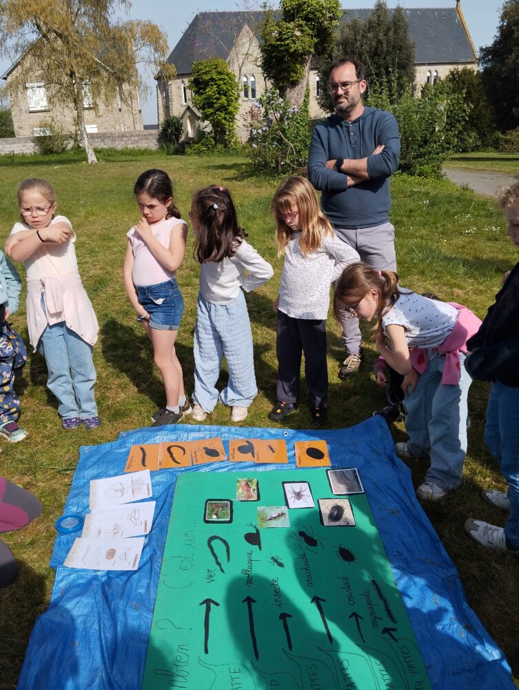 Les élèves de CE1/CE2 ont travaillé toute la matinée en “classe dehors” avec Edwidge, la maîtresse, des parents et grand-parent sur la thématique des “décomposeurs”. Ces petites bêtes sont des êtres vivants qui contribuent à la dégradation de la matière organique morte ou des excréments en les restituant sous forme minérale. Ils jouent un rôle crucial au sein d’un écosystème car ils participent au recyclage des éléments. Les enfants ont du chercher, observer attentivement, classer et décrire ces petites bêtes si utiles. Le parc des soeurs est un lieu formidable pour ce travail hors la classe.
