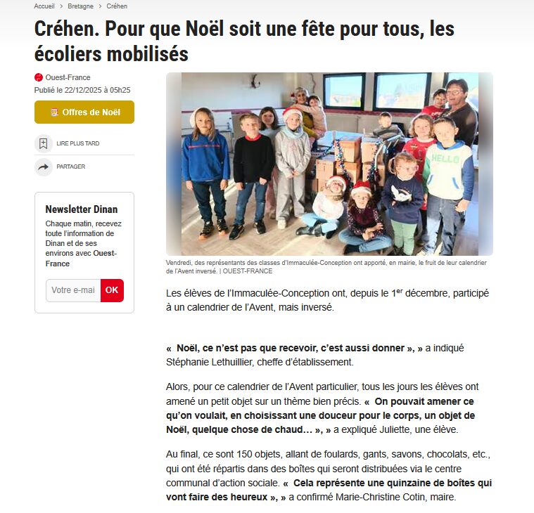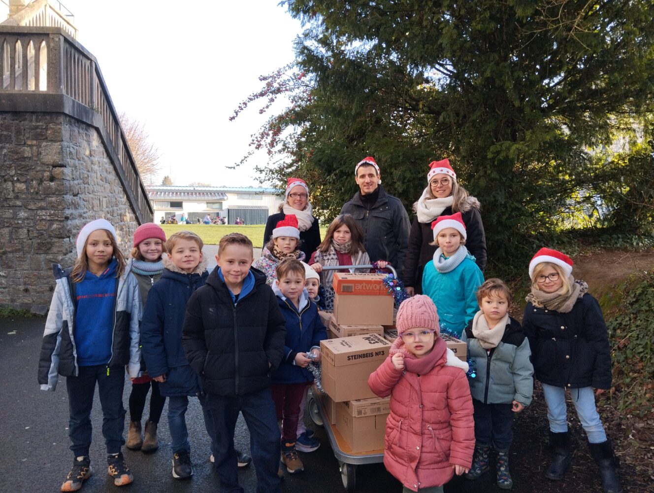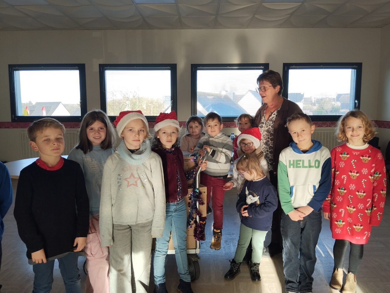 Notre calendrier de l’Avent inversé s’est achevé le jeudi 18 décembre. Alors, sur un chariot semblable à un traineau, 12 enfants de l’école (2 par classes) accompagnés de parents de l’Apel et de Mme Lethuillier se sont rendus à la mairie de la commune. Ils ont été, tels des lutins de Noël, accueillis par Mme Cotin, maire de la commune de Créhen. Ce sont 150 cadeaux qui ont été offerts pour que chacun puisse bénéficier de la chaleur de Noël. Un grand merci aux familles qui ont accompagné ce projet de fraternité et de solidarité.